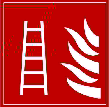 Red Emergency Fire Ladder Sign with White Ladder and Flames Icons, indicating the location of a fire escape ladder for safe evacuation during fire or emergency situations