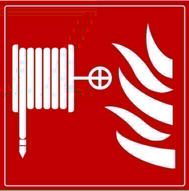Fire Hose Reel Safety Sign with Flames Icon on Red Background for Emergency Firefighting Equipment